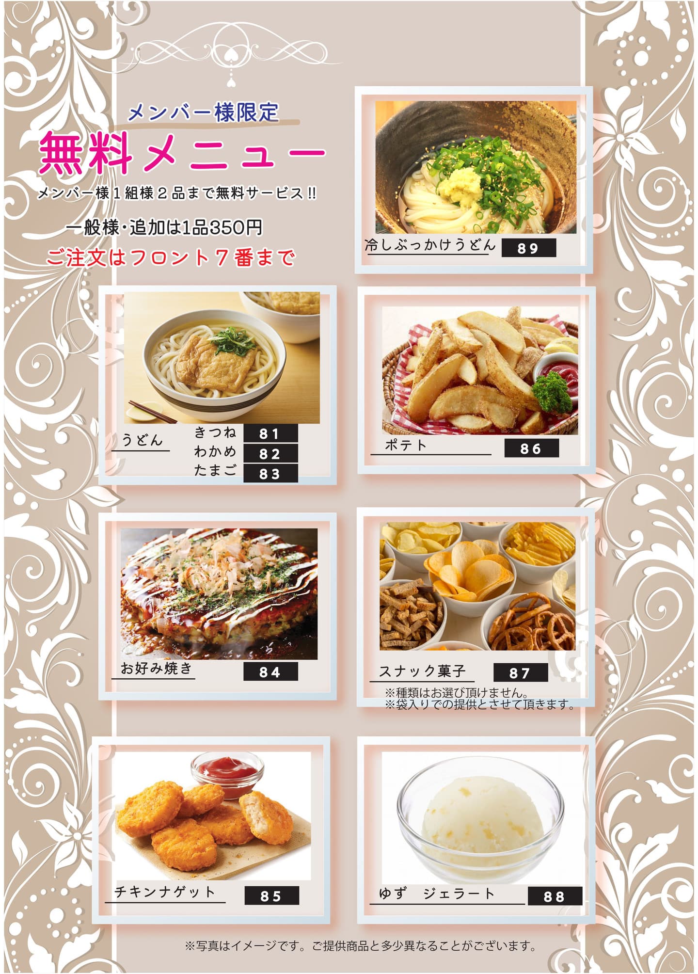 メンバー様限定1組様2品迄お食事無料サービス